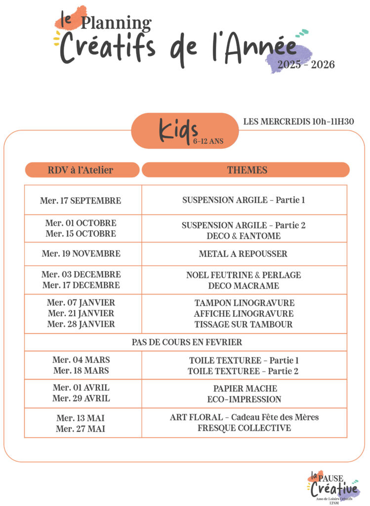 Via l’Association « La Pause Créative », Association de La Tranche Sur Mer, je retrouve durant toute l’année scolaire vos enfants, à raison d’un rdv tous les 15 jours pour les 6-12 ans et une fois par mois pour les 3-5 ans, pour les initier a de nouvelles techniques créatives, travailler l’imaginaire, la motricité, leur créativité, apprendre l’art, les peintres etc… Voici le programme pour l’année 2025/2026 !